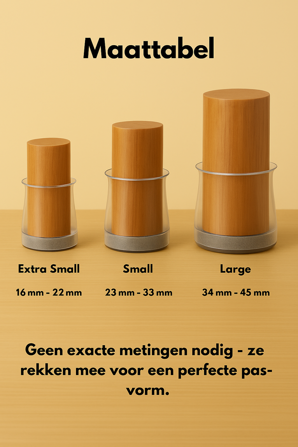Heel eenvoudig! Schuif de GlideGuard™ doppen direct over de stoelpoten heen. Er is geen lijm, schroef of gereedschap nodig – het flexibele siliconenmateriaal past zich automatisch aan de vorm van je stoelpoot aan.