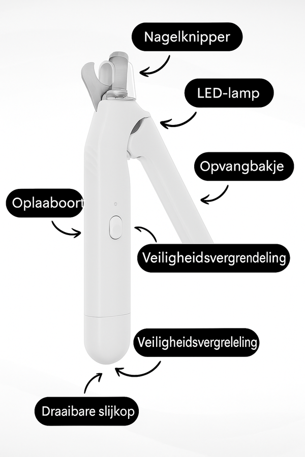 💡 LED-verlichting – zorgt voor exacte zichtbaarheid van de bloedlijn, zelfs bij donkere nagels.
