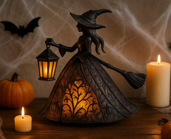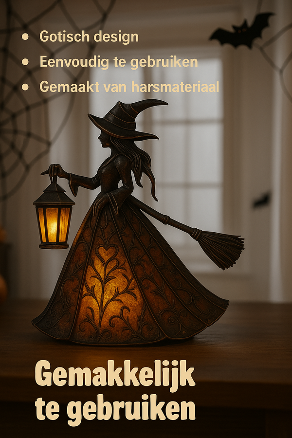 Breng een vleugje magie in huis met de Heksenlamp voor Halloween. Met haar betoverende lantaarn en warme gloed verandert ze elke ruimte in een mysterieuze, maar sfeervolle plek. Perfect voor op de eettafel, boekenplank of vensterbank – deze handgemaakte lamp van hars voegt direct charme toe aan jouw Halloween-decoratie. Laat de heks haar licht schijnen en creëer een spookachtig gezellige sfeer die iedereen betovert.