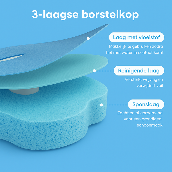 🌀 3-laagse reinigingskop – Spons-, schuim- en reinigingslaag werken samen voor grondige, frisse resultaten.