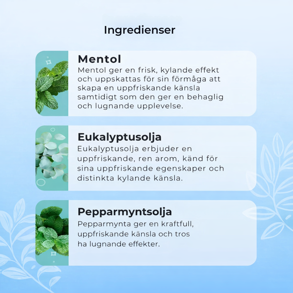 Eenvoudige inhalatie activeert koelende sensaties en essentiële oliën, waardoor je sneller focust en vrijer ademt in dagelijkse situaties.