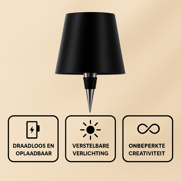 VinoGlow™ verandert elke lege fles in seconden in een stijlvolle, sfeervolle lamp. Draadloos, oplaadbaar en geschikt voor elke fles — van wijn tot whisky. Met warm, verstelbaar LED-licht creëer je moeiteloos een luxe ambiance in huis, op het terras of tijdens diners. Een unieke eyecatcher die creativiteit, design en gezelligheid combineert. De perfecte decoratie of cadeau-tip!