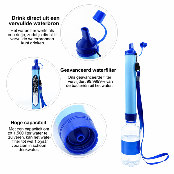De overheid adviseert om een noodpakket in huis te hebben — maar liters water opslaan kost ruimte en is onhandig. Met dit compacte waterfilter maak je in noodsituaties veilig drinkwater uit vrijwel elke waterbron. Het filtert tot 1.500 liter water en verwijdert 99,9999% van bacteriën, zonder stroom of batterijen. Altijd klaar voor gebruik, thuis of onderweg. Een simpele, ruimtebesparende oplossing voor echte zekerheid wanneer het erop aankomt.